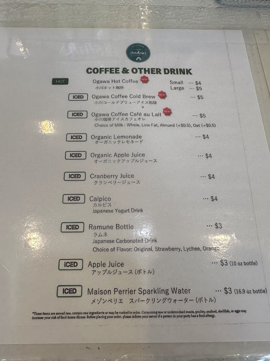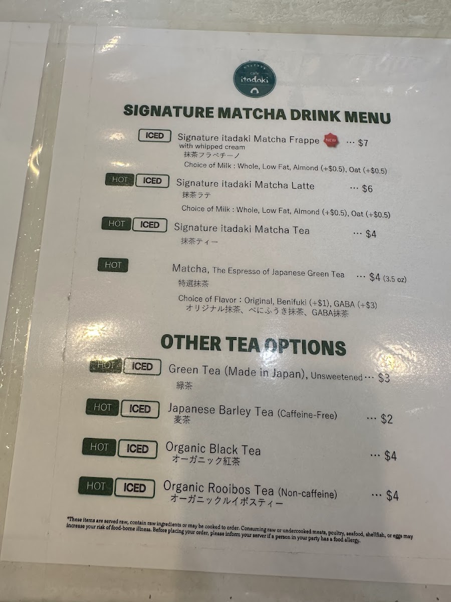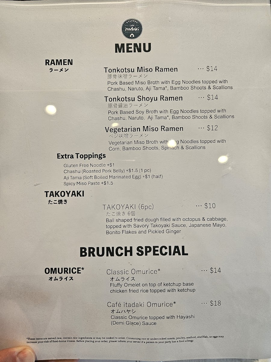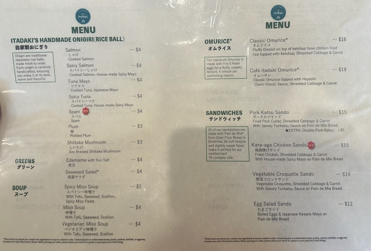 At Cafe Itadaki on 24 Harvard St, Brookline, the menu offers a carefully curated selection that celebrates Japanese comfort food with both variety and charm. For quick bites, the Onigiri options like Spicy Salmon, Spicy Tuna, Salmon, Tuna Mayo, and Plum are satisfying and portable. Sandwich enthusiasts can enjoy the hearty Pork Katsu Sando, Vegetable Croquette Sando, Egg Salad Sando, or the indulgent Kara-Age Fried Chicken Sando. The ramen lineup features rich bowls such as Tonkotsu Miso Ramen, Tonkotsu Shoyu Ramen, Tori Paitan Ramen, and a Vegetarian Miso Ramen for lighter tastes. Curry lovers will find classics like Pork Katsu Curry, Kara-Age Fried Chicken Curry, Vegetable Croquette Curry, Fried Shrimp Curry, and Plain Curry, while the Omurice offerings - Classic Omurice and Cafe Itadaki Omurice - showcase comforting, fluffy eggs over savory rice. Popular Japanese street foods like Takoyaki (6pc or 12pc), Kara-Age Fried Chicken, and Okonomiyaki round out the mains. Light bites and sides include Edamame With Sea Salt, Seaweed Salad, Spicy Miso Soup, Miso Soup, Vegetarian Miso Soup, Side White Rice, Side Spicy Mayo, Side Japanese Mayo, Side Pork Katsu, and Side Kara-Age Chicken. For dessert, the café tempts with Matcha Mille Crepe Cake, Matcha Cheese Cake, Taiyaki, and Japanese Roll Cake (available in 1pc or 2pc). To complement the food, a full range of drinks is available, from Signature Matcha Latte (Hot/Iced) and Signature Matcha Tea (Hot/Iced) to Japanese Green Tea, Signature Itadaki Matcha Frappe (Iced), and Barley Tea, providing both refreshing and warming options. Overall, the menu balances traditional Japanese flavors with modern café favorites, offering something for both casual diners and dedicated food enthusiasts.