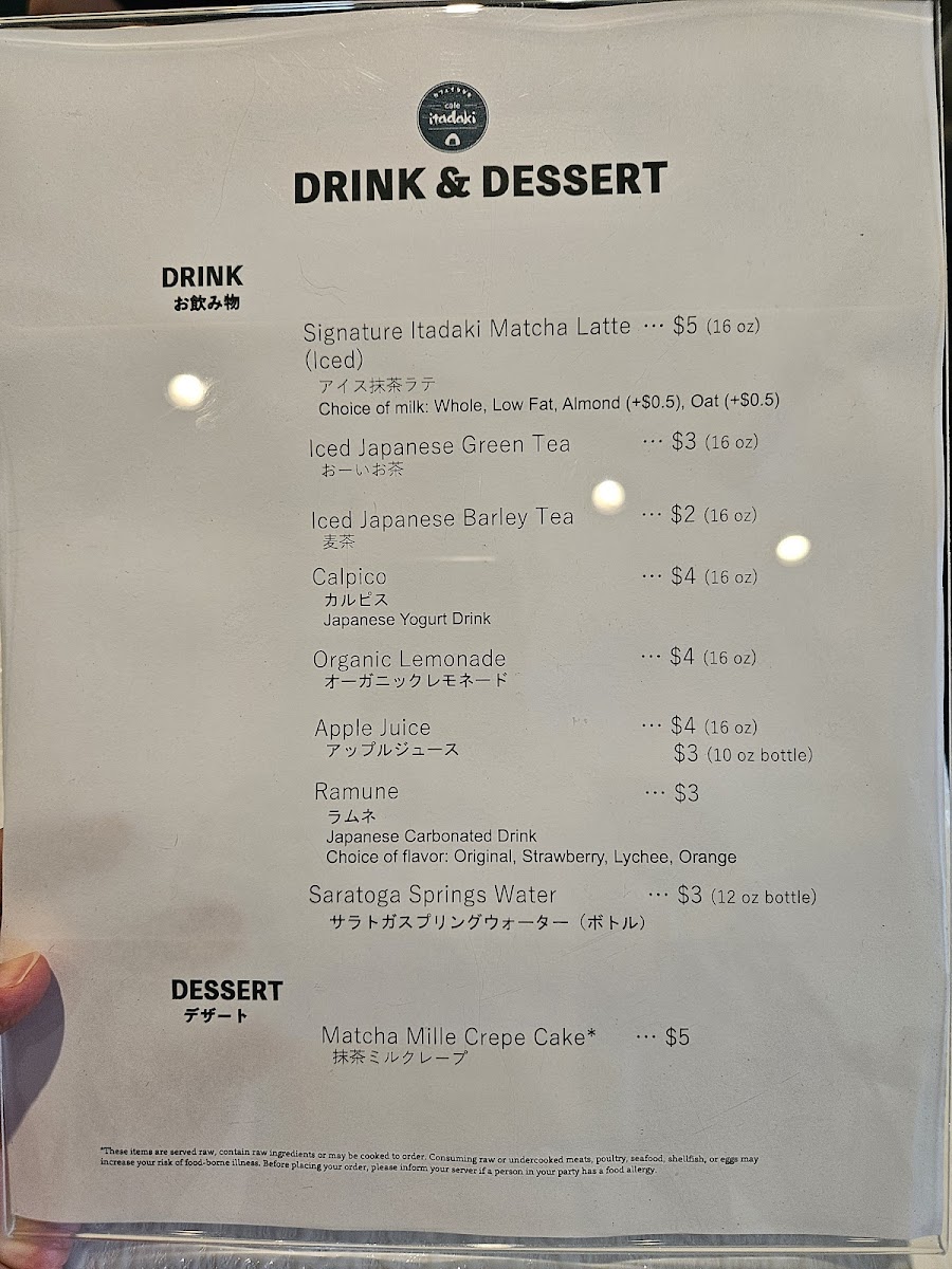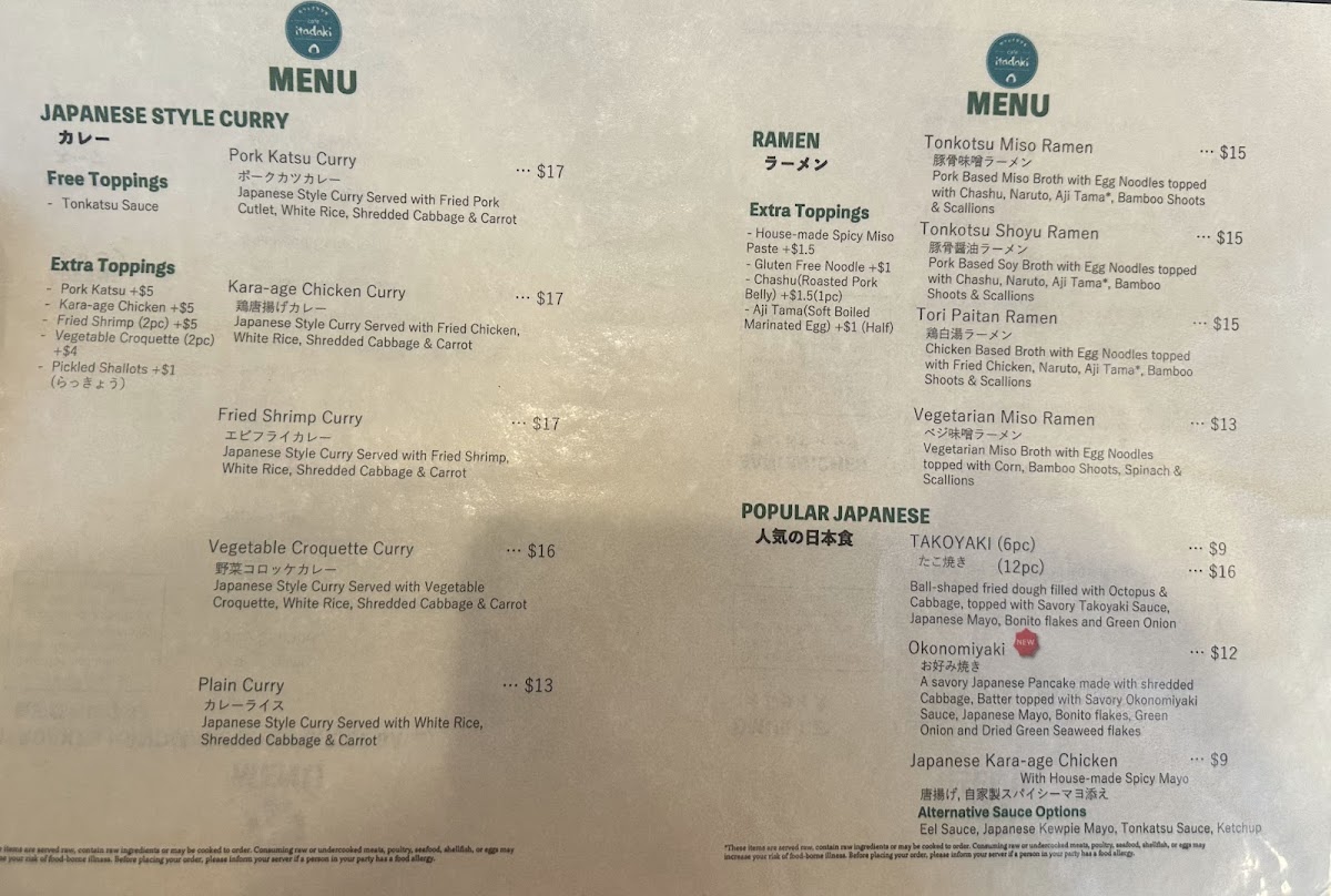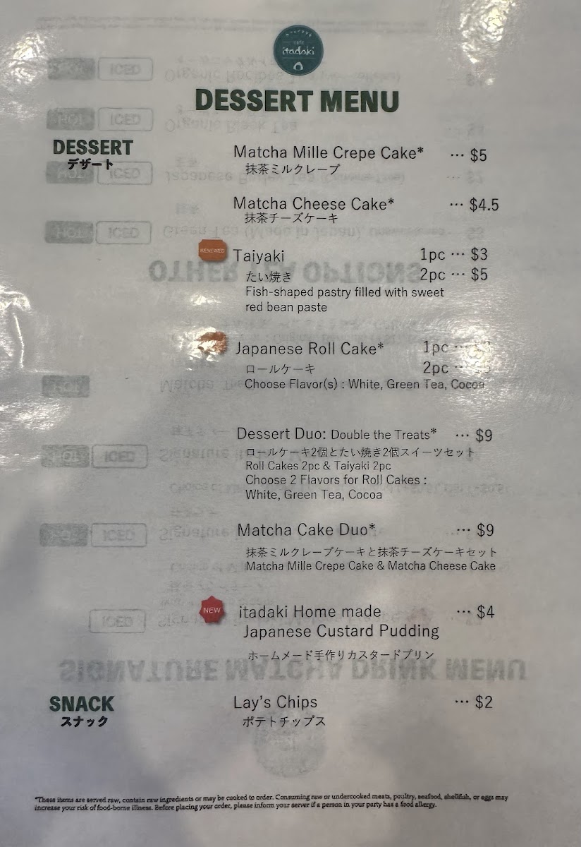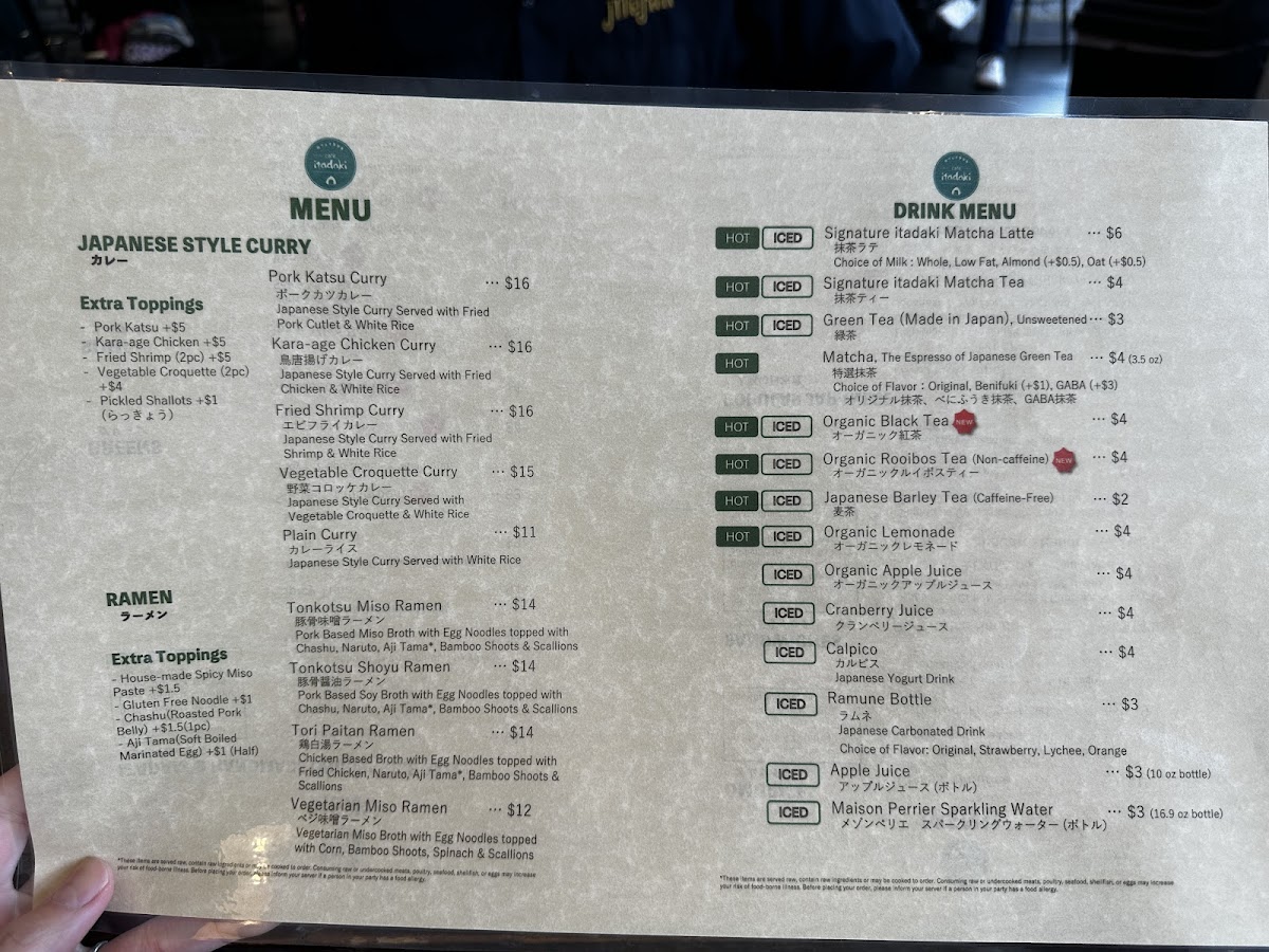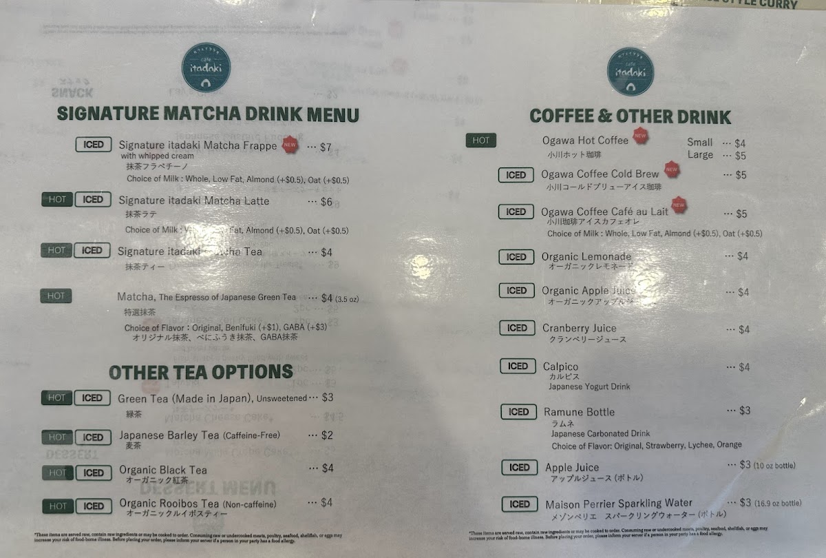 At Cafe Itadaki on 24 Harvard St, Brookline, the menu offers a carefully curated selection that celebrates Japanese comfort food with both variety and charm. For quick bites, the Onigiri options like Spicy Salmon, Spicy Tuna, Salmon, Tuna Mayo, and Plum are satisfying and portable. Sandwich enthusiasts can enjoy the hearty Pork Katsu Sando, Vegetable Croquette Sando, Egg Salad Sando, or the indulgent Kara-Age Fried Chicken Sando. The ramen lineup features rich bowls such as Tonkotsu Miso Ramen, Tonkotsu Shoyu Ramen, Tori Paitan Ramen, and a Vegetarian Miso Ramen for lighter tastes. Curry lovers will find classics like Pork Katsu Curry, Kara-Age Fried Chicken Curry, Vegetable Croquette Curry, Fried Shrimp Curry, and Plain Curry, while the Omurice offerings - Classic Omurice and Cafe Itadaki Omurice - showcase comforting, fluffy eggs over savory rice. Popular Japanese street foods like Takoyaki (6pc or 12pc), Kara-Age Fried Chicken, and Okonomiyaki round out the mains. Light bites and sides include Edamame With Sea Salt, Seaweed Salad, Spicy Miso Soup, Miso Soup, Vegetarian Miso Soup, Side White Rice, Side Spicy Mayo, Side Japanese Mayo, Side Pork Katsu, and Side Kara-Age Chicken. For dessert, the café tempts with Matcha Mille Crepe Cake, Matcha Cheese Cake, Taiyaki, and Japanese Roll Cake (available in 1pc or 2pc). To complement the food, a full range of drinks is available, from Signature Matcha Latte (Hot/Iced) and Signature Matcha Tea (Hot/Iced) to Japanese Green Tea, Signature Itadaki Matcha Frappe (Iced), and Barley Tea, providing both refreshing and warming options. Overall, the menu balances traditional Japanese flavors with modern café favorites, offering something for both casual diners and dedicated food enthusiasts.